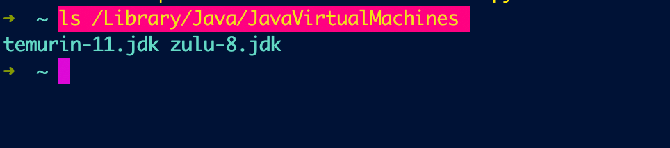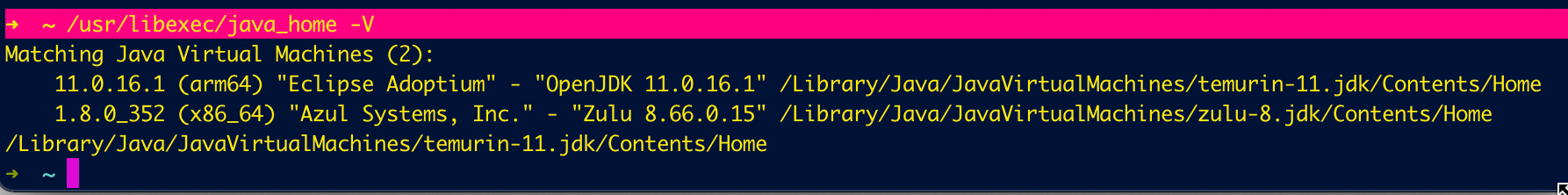 우선 터미널에 아래와 같이 치면 가지고 있는 자바들 버전이 나온다.