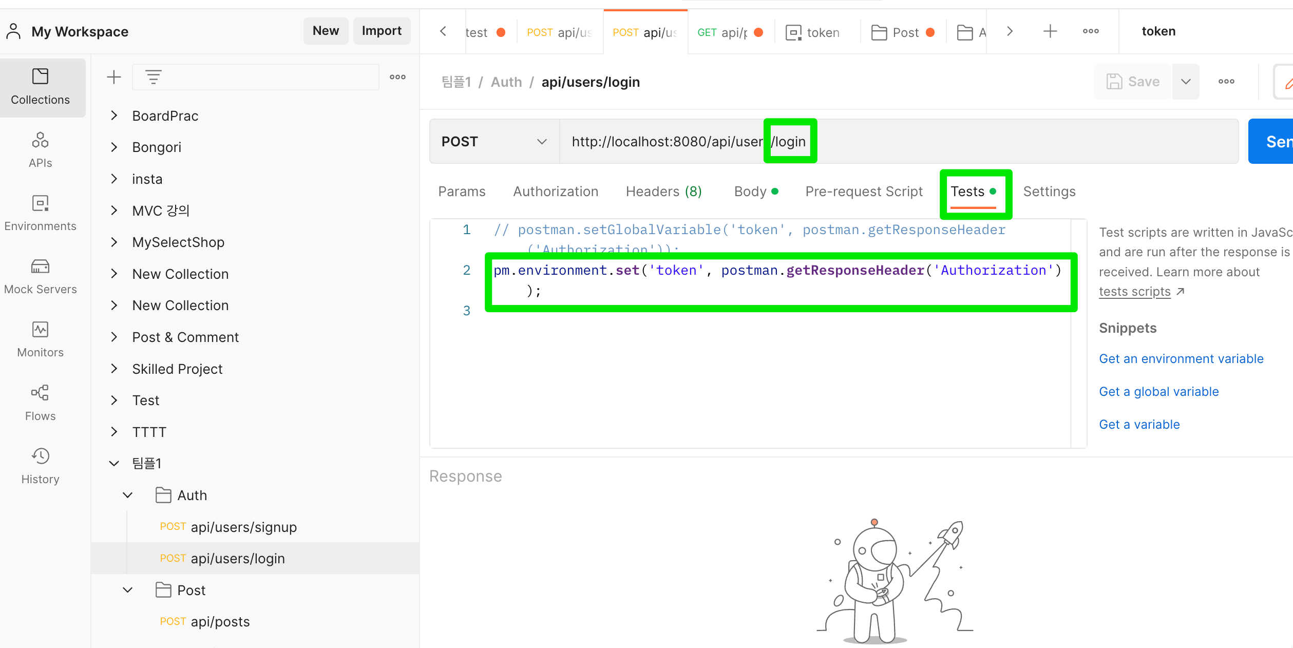 2. 로그인 api에 Tests에 다음과 같이 적어준다.