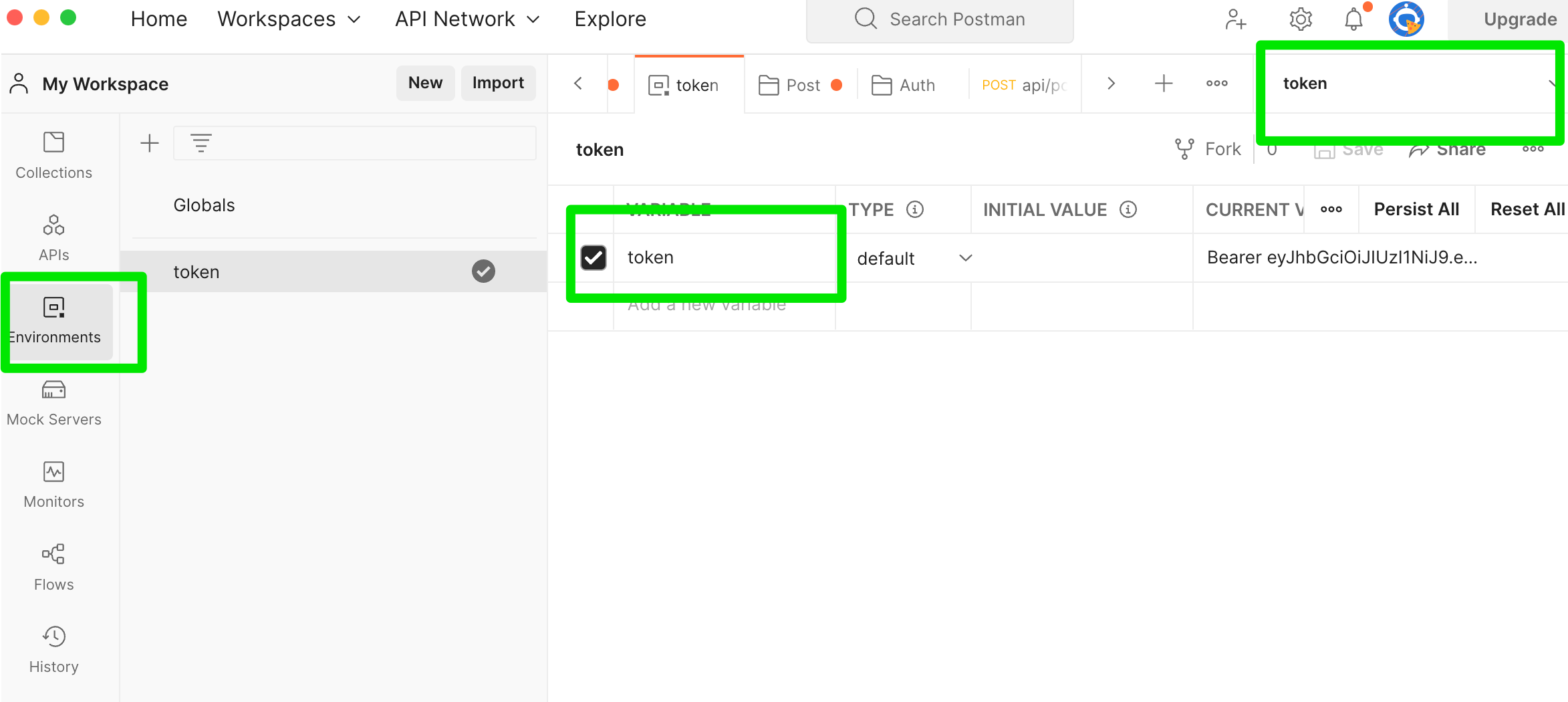 1. environments-> variable에 token을 적어준다.